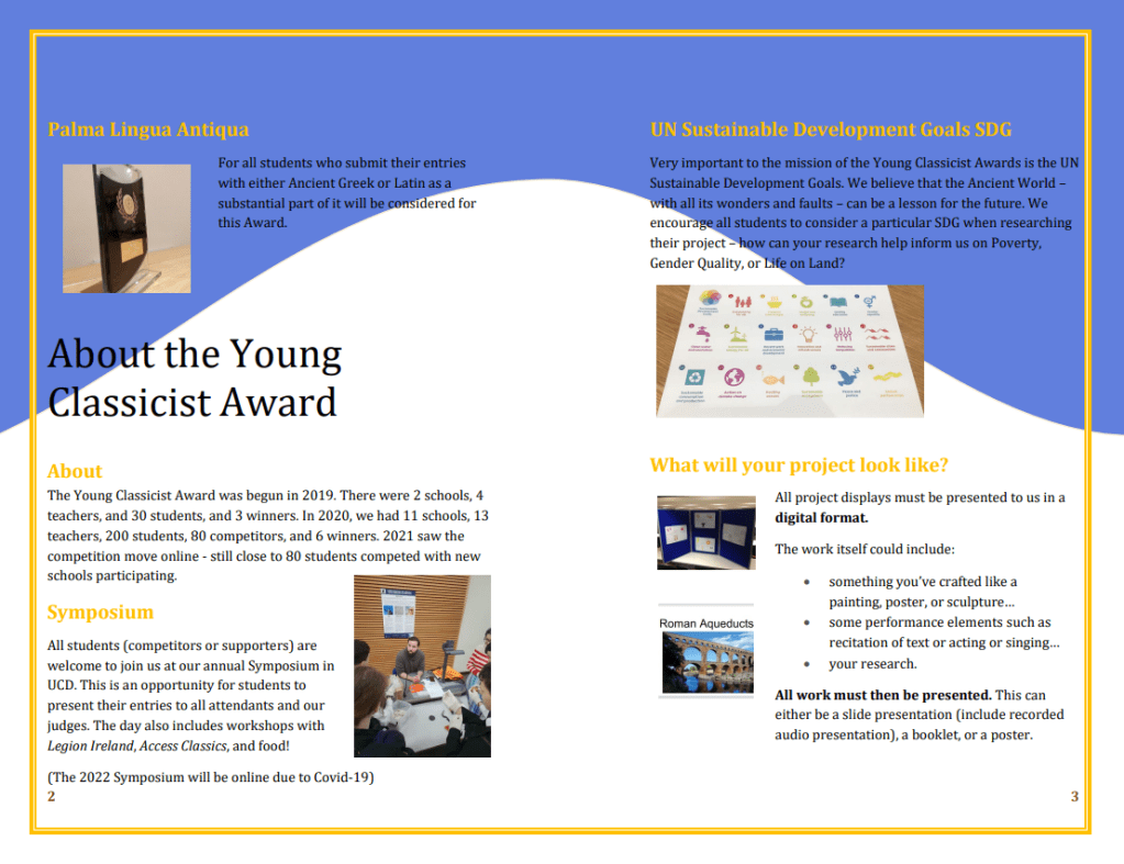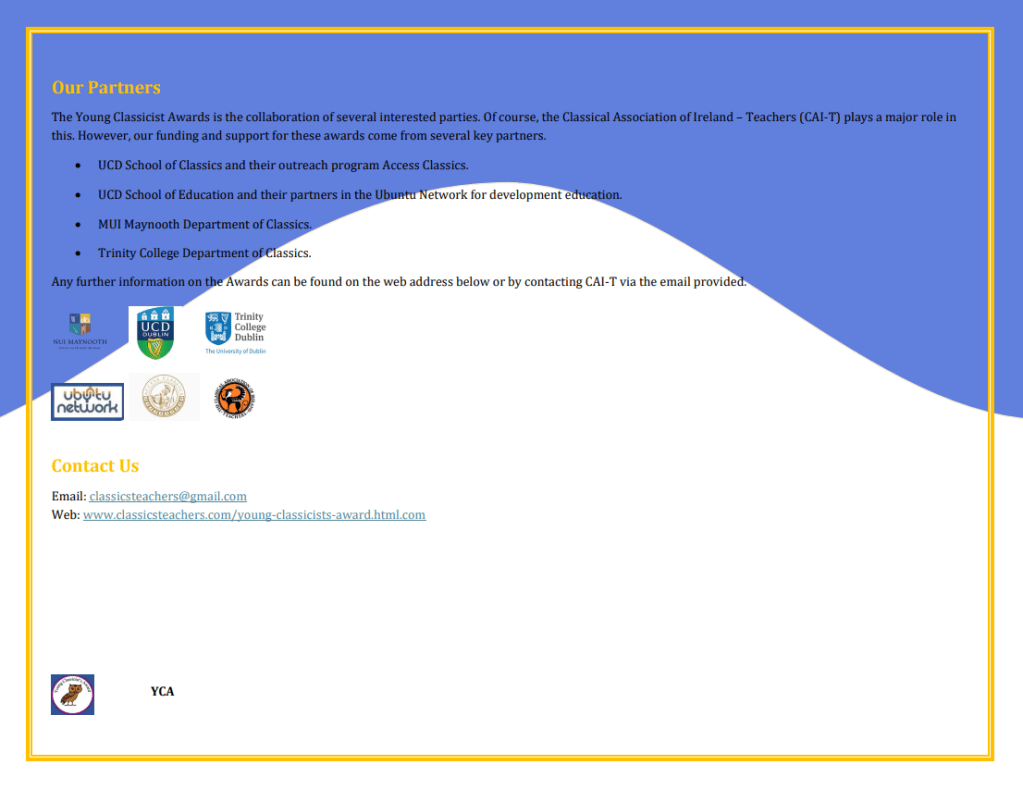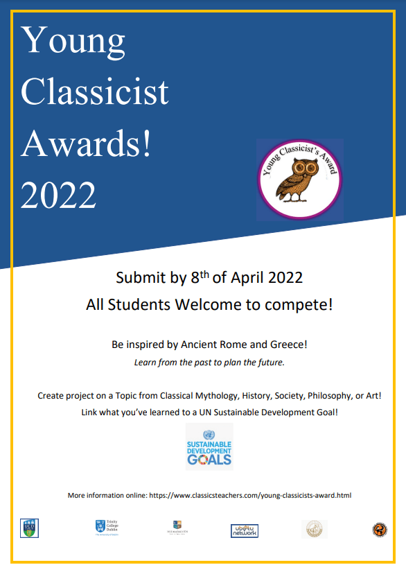 As usual, we are incredibly grateful to everyone who has supported and interacted with us over the 2021/22 academic year. It has been a very heartening experience to once again visit second-level schools and throw open the doors of UCD to the students: thank you to all of the teachers and students we met this year, and we hope to see you again next year! Thank you to Dr Jo Day for being so accommodating with the UCD Classics museum and with trusting us to bring some artefacts with us on school visits! Thank you to Eleanor Kellett and Maria Wood for their always-wonderful podcasts and help. And thank you to the UCD School of Classics and the College of Arts and Humanities for their constant support.