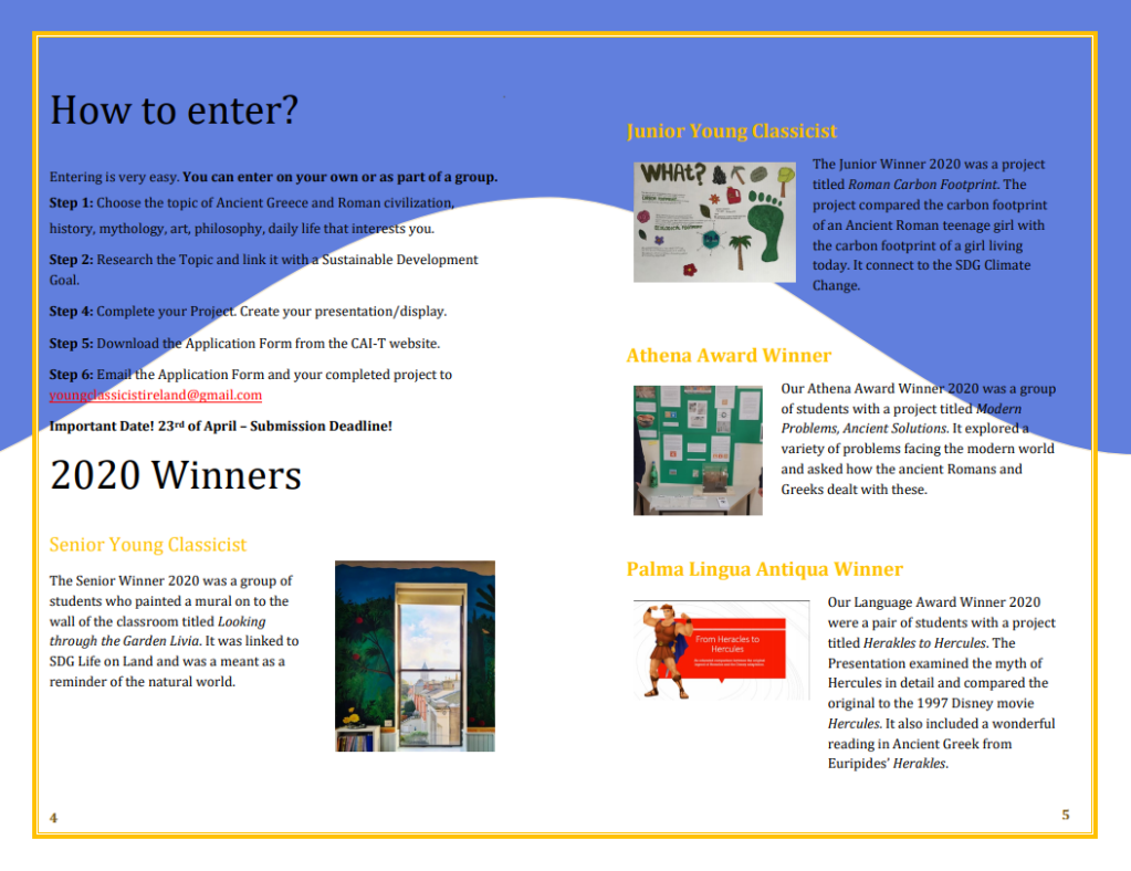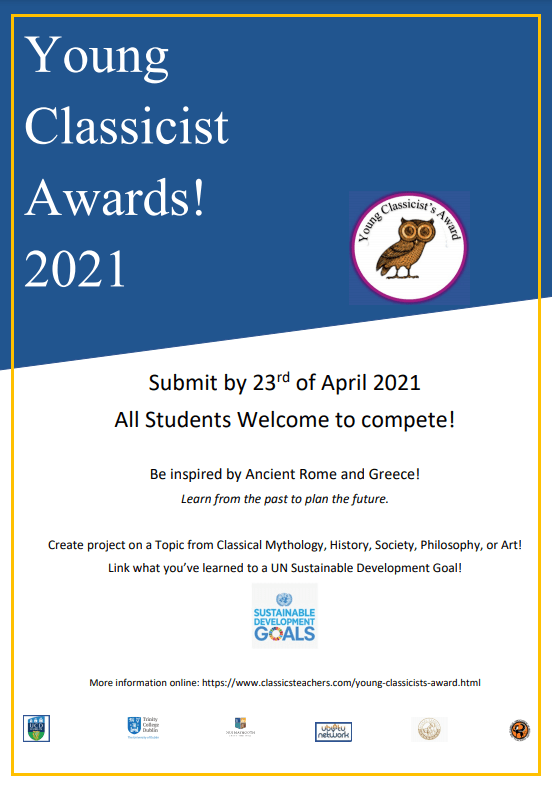 Calling all young Classicists! The Young Classicist Awards 2021 is now open for entries! This exciting initiative encourages secondary-school students to present a project on any aspect of Classics – this can be a craft, such as a poster or a painting, or it can involve some manner of performance, such as singing or recitation.