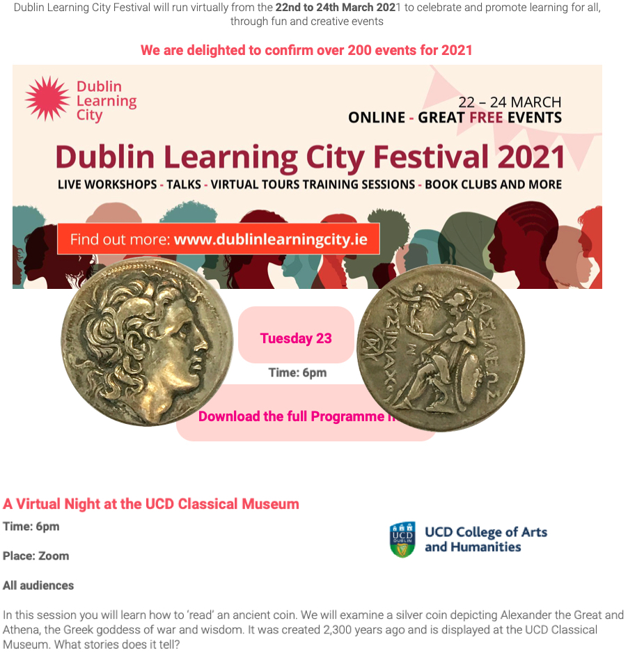 The Creative Arts Summer School is one of the projects of Dublin Learning City, a festival that promotes learning through an amazing range of creative online activities. With the encouragement of UCD Access and Lifelong Learning, Access Classics continued their participation in the festival by offering a virtual night at the UCD Museum! Dr Christopher Farrell took the audience through a ‘reading’ of a 2,300-year-old coin depicting Alexander the Great and Athena, the Greek goddess of war and wisdom! You can download the handout from the event in the post below!